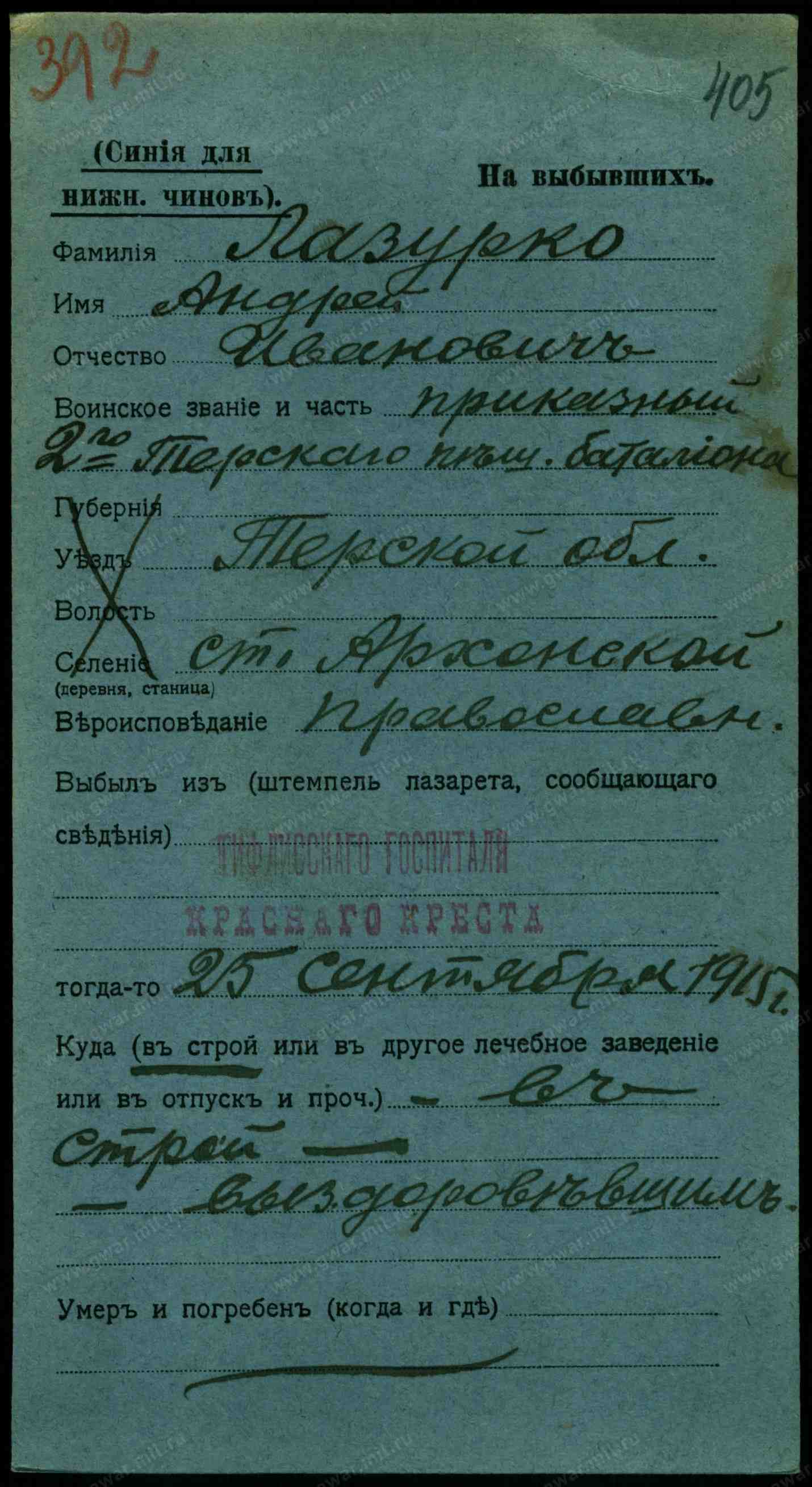 Лазурко Иван Иванович, род. 9 августа 1895. Казак станицы Архонской ТКВ, православный. Окончил станичное училище. Участник Первой мировой войны. 20 октября 1915 г. зачислен в Сунженско-Владикавказскую запасную сотню. 6 ноября 1916 г. окончил 1-ю Иркутскую школу прапорщиков и зачислен в Терскую запасную пешую сотню. С 8 декабря 1916 г. младший офицер 4-й сотни 1-го Осетинского пешего батальона. С 28 июля 1917 г. в Терской запасной пешей сотне. С января 1918 г. во 2-м Терском пластунском батальоне. Участник Белого Движения. С 26 марта 1919 г. во 2-м Сунженско-Владикавказском полку. С 1920 г. проживал в своей станице. 7 апреля 1924 г. приговорен к ссылке на 4 года. Жил в Красноярском крае, работал техником на комбинате «Минусинск-золото». Арестован и 7 декабря 1937 г. Тройкой НКВД СОАССР приговорен к расстрелу. Жена – Дмитриева Фекла Георгиевна.