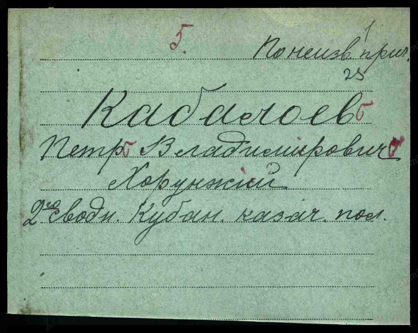 Кабалоев Петр. Из казаков Терской обл. Оренбургское казачье училище 1914. Офицер Горско-Моздокской запасной сотни, затем Екатеринославского полка Кубанского казачьего войска. В Добровольческой армии и ВСЮР. Сотник во 2-м Сводно-Кубанском казачьем полку. Убит в мае 1919. /532/