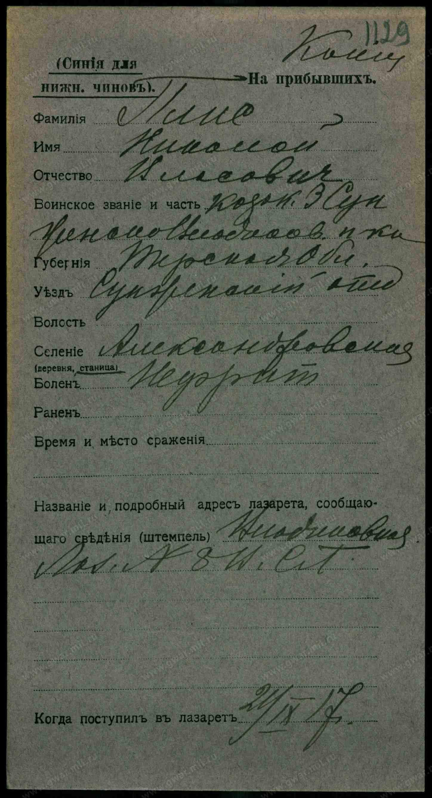 Тип документа Карточка на прибывших (нижние чины)
