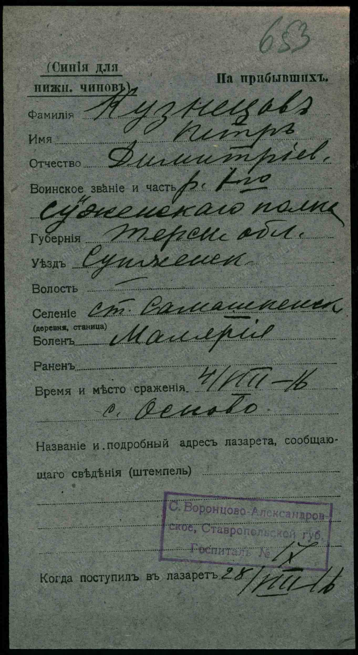 Тип документа Карточка на прибывших (нижние чины)