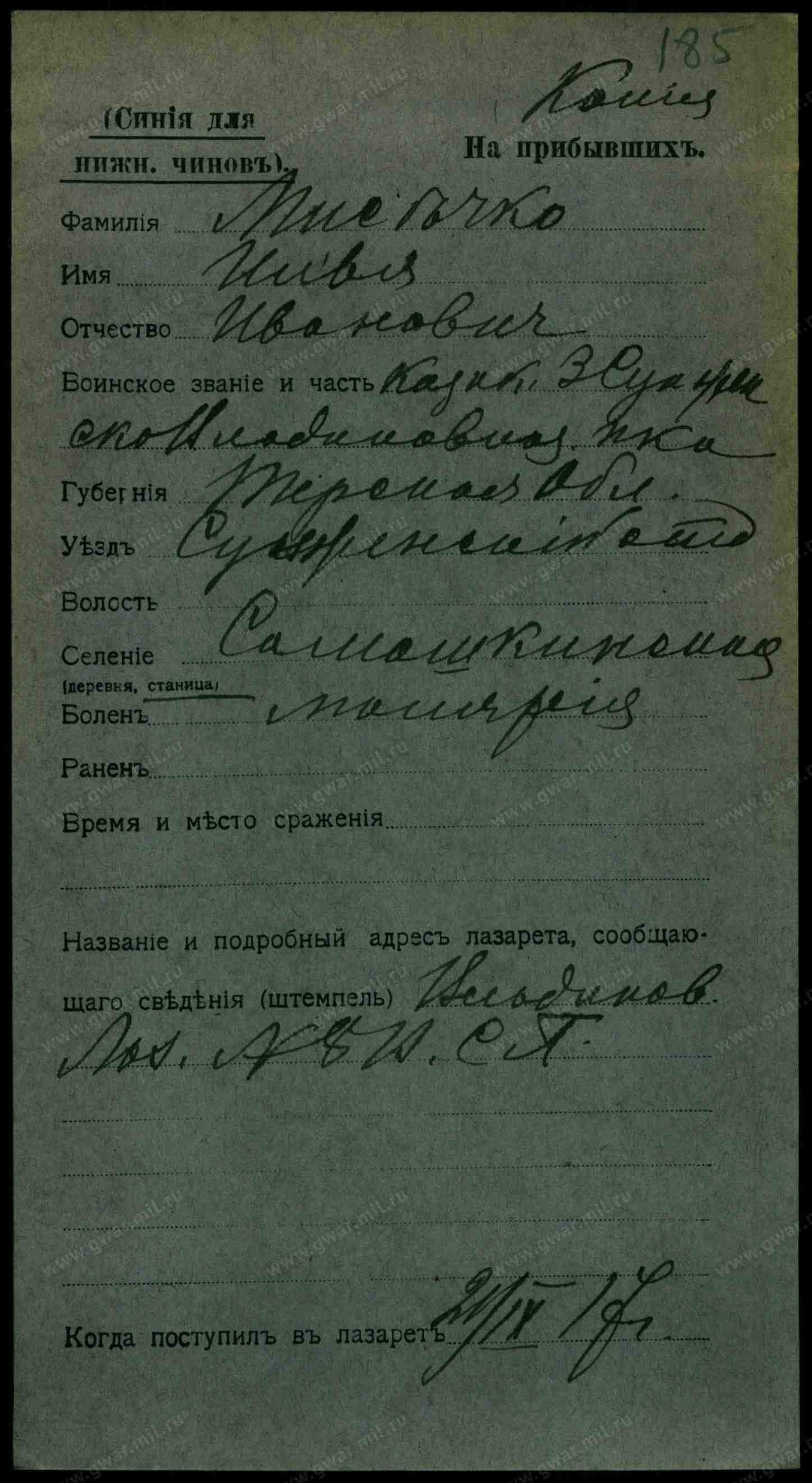 Тип документа Карточка на прибывших (нижние чины)