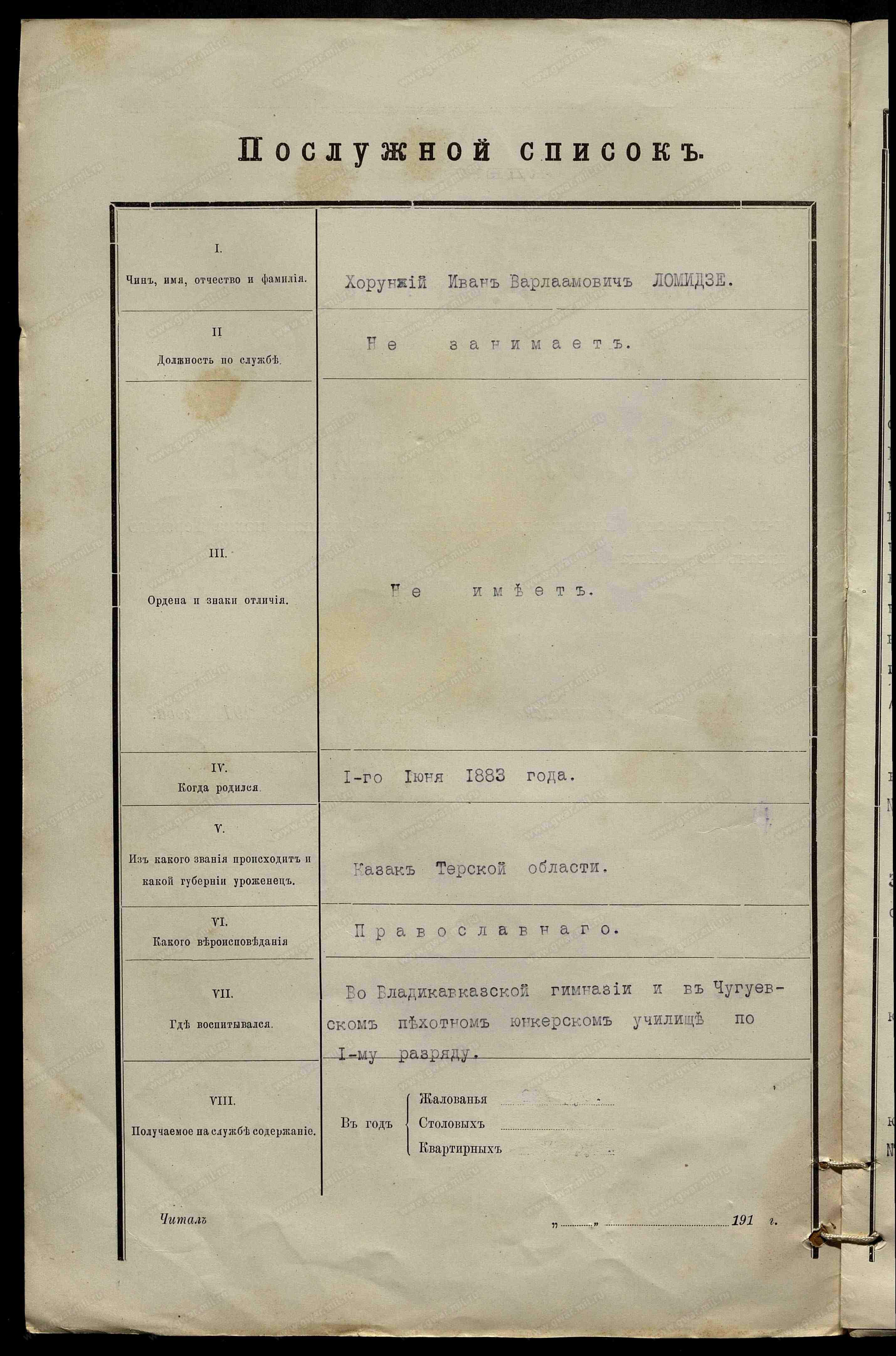 Увольняются за прослужением трехлетнего срока к 1января сего г.атаман станицы Александроневской, Кизлярского отдела, урядник Иван Туманов, и от должностей почетных сулей той станицы урядники Никифор Климов, Алексей Шапошников и Варлам Ламидзе, а вместо их с того же времени утверждаются атаманом той станицы казак Евстафий Ламидзе (31 г.) и в должности почетных судей урядники Авксентий Ващанный (58 л.) на второе трехлетие, Денис Донсков (46 л.), Захар Бабилуров (50 л.) и Егор Мансурадзе (49 л.) на первое трехлетие.