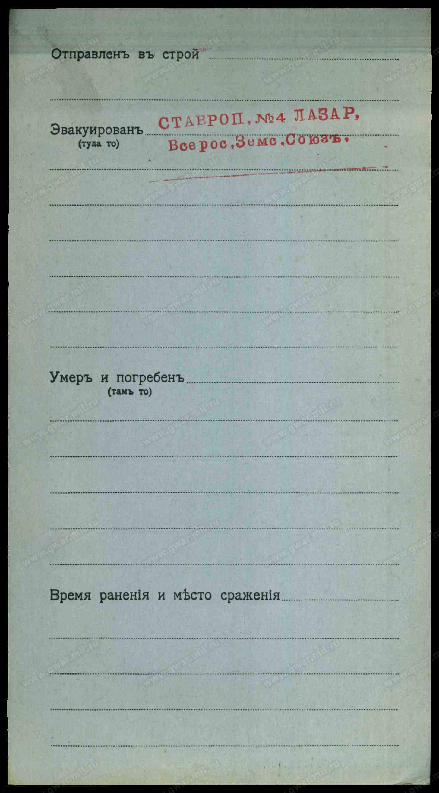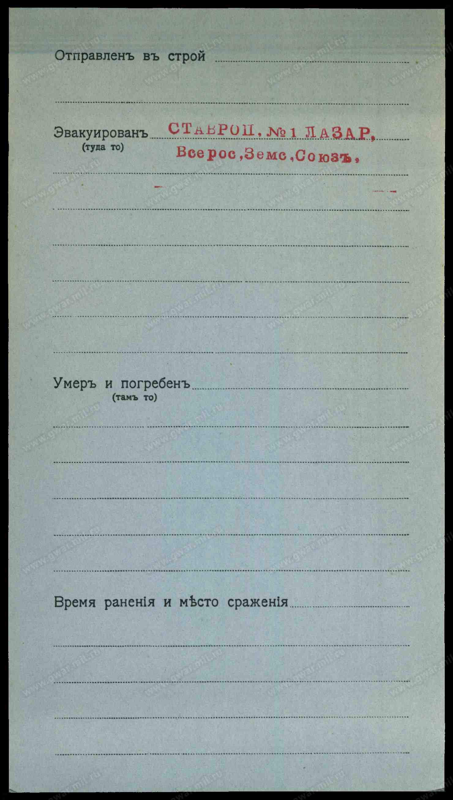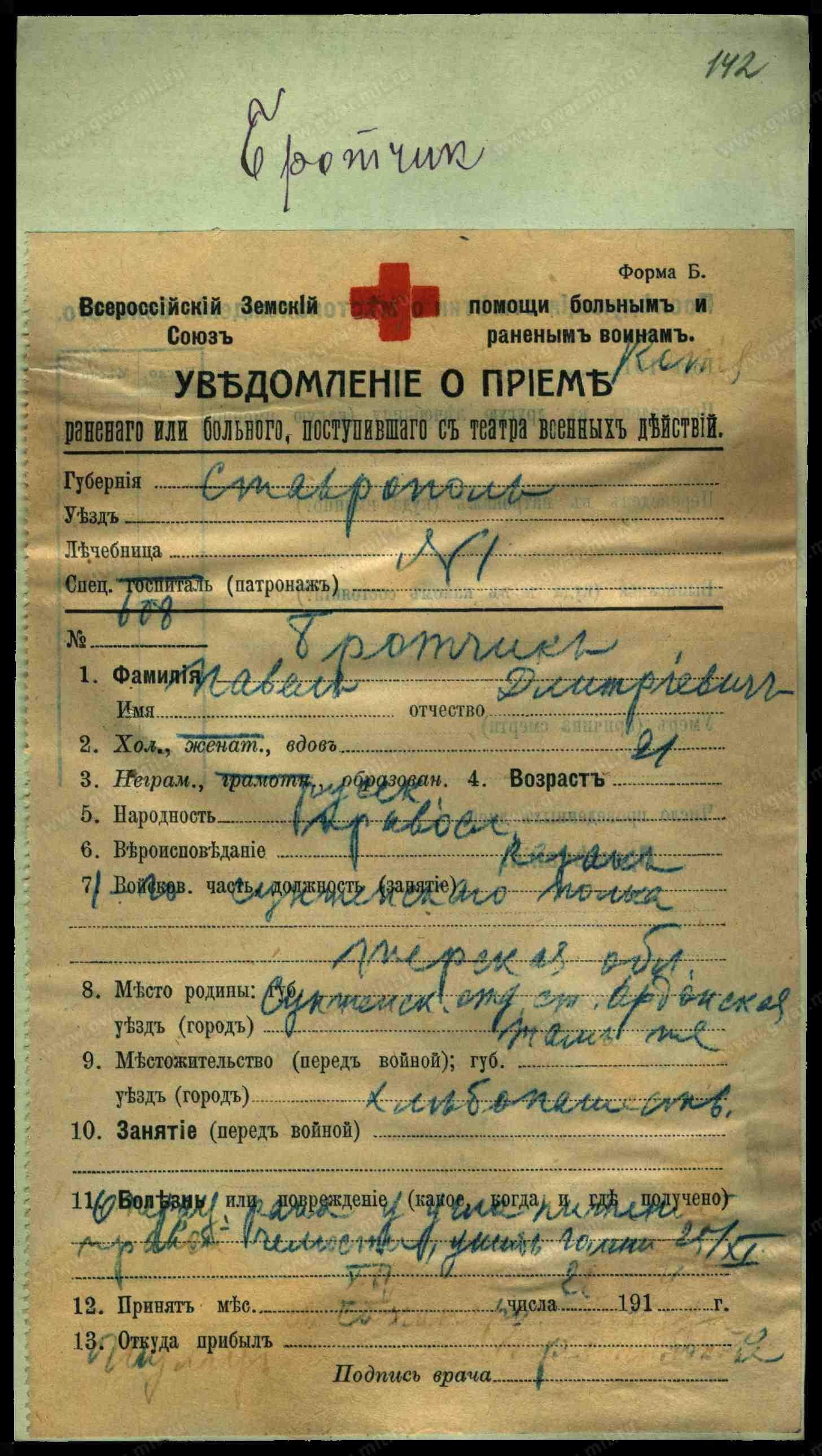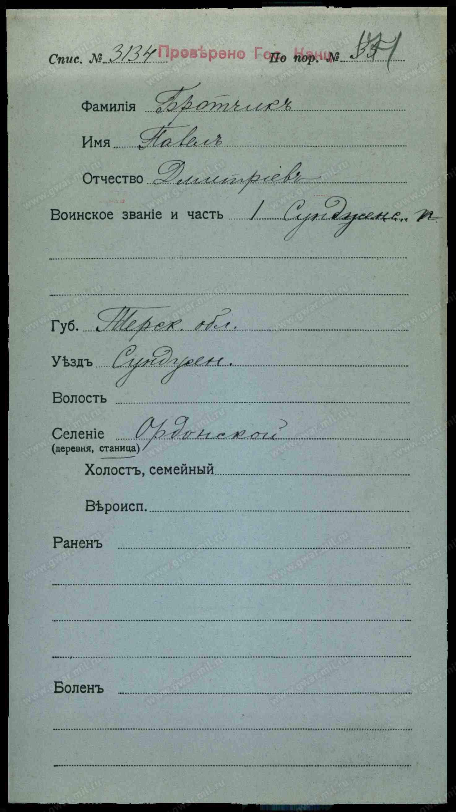124. Братчик Павел Дмитриевич, женат, ст. Ардонская, тяжело ранен ружейной пулей в левое плечо и бок 5 апреля 1916 г. у сел. Хизан, отправлен туда же.