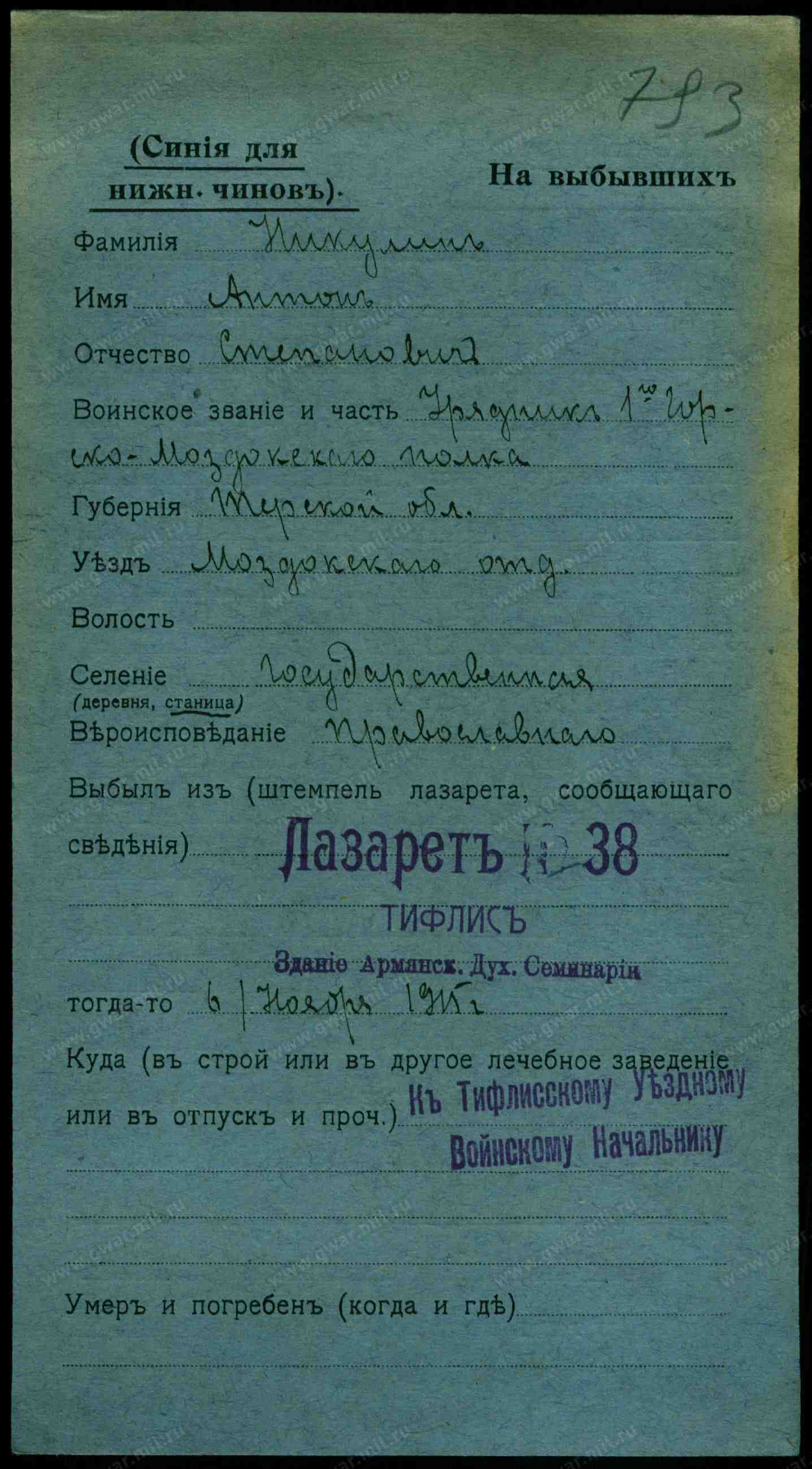 7 февраля 1914 года умерла и 9 февраля 1914 года погребена на военно-госпитальном кладбище казачка станицы Государственной, Терской обл., Наталия Евмениева Никулина 48 лет, от септицемии.