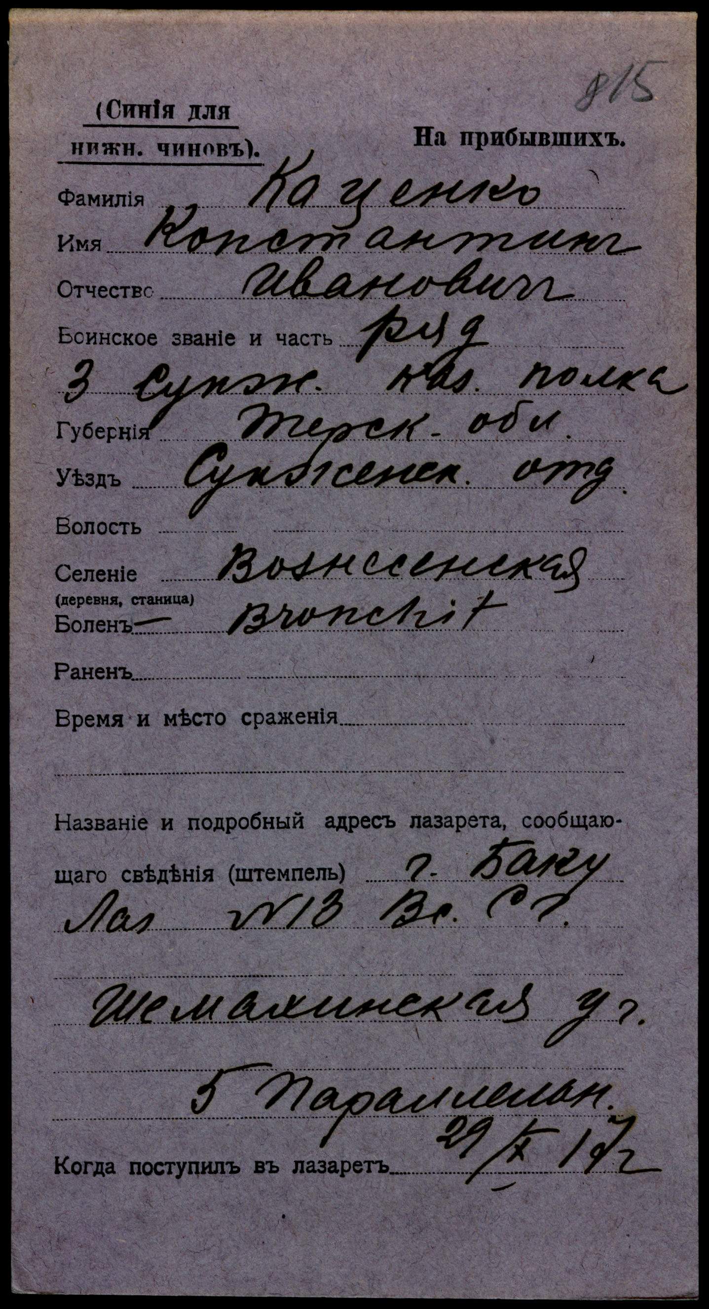 Тип документа Карточка на прибывших (нижние чины)