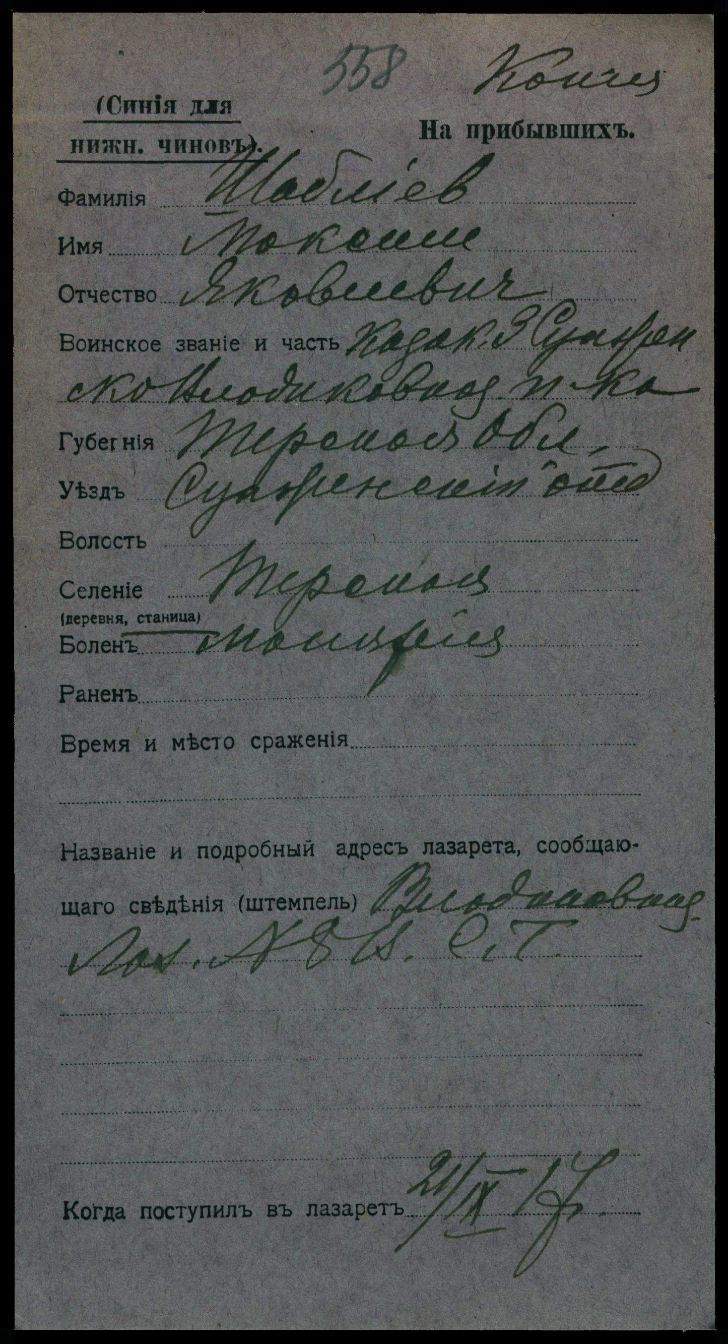 Тип документа Карточка на прибывших (нижние чины)