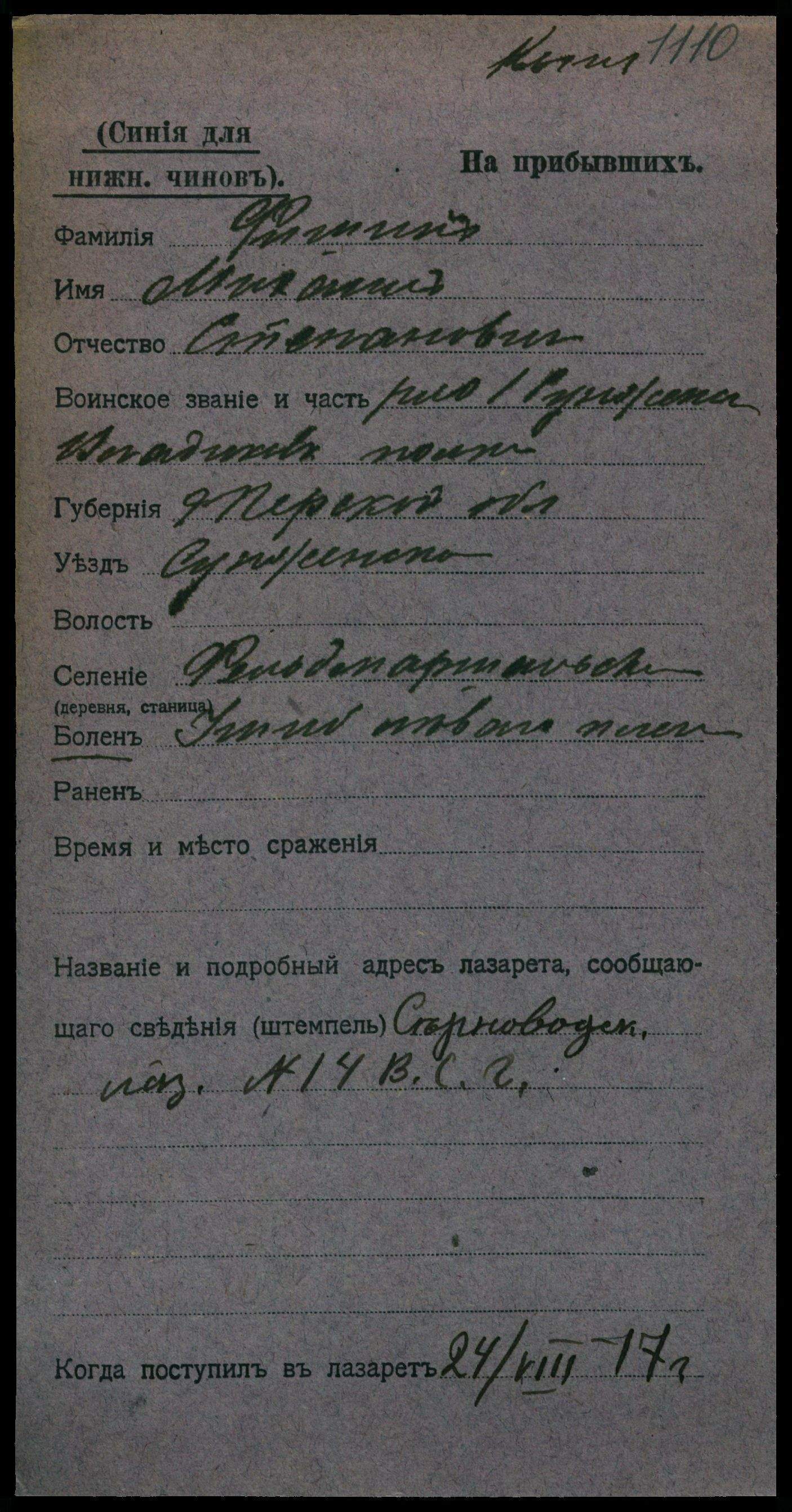 Тип документа Карточка на прибывших (нижние чины)
