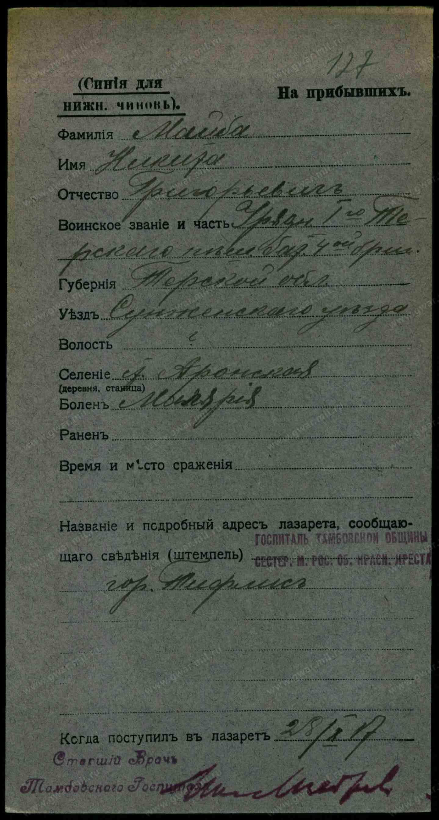 Тип документа Карточка на прибывших (нижние чины)