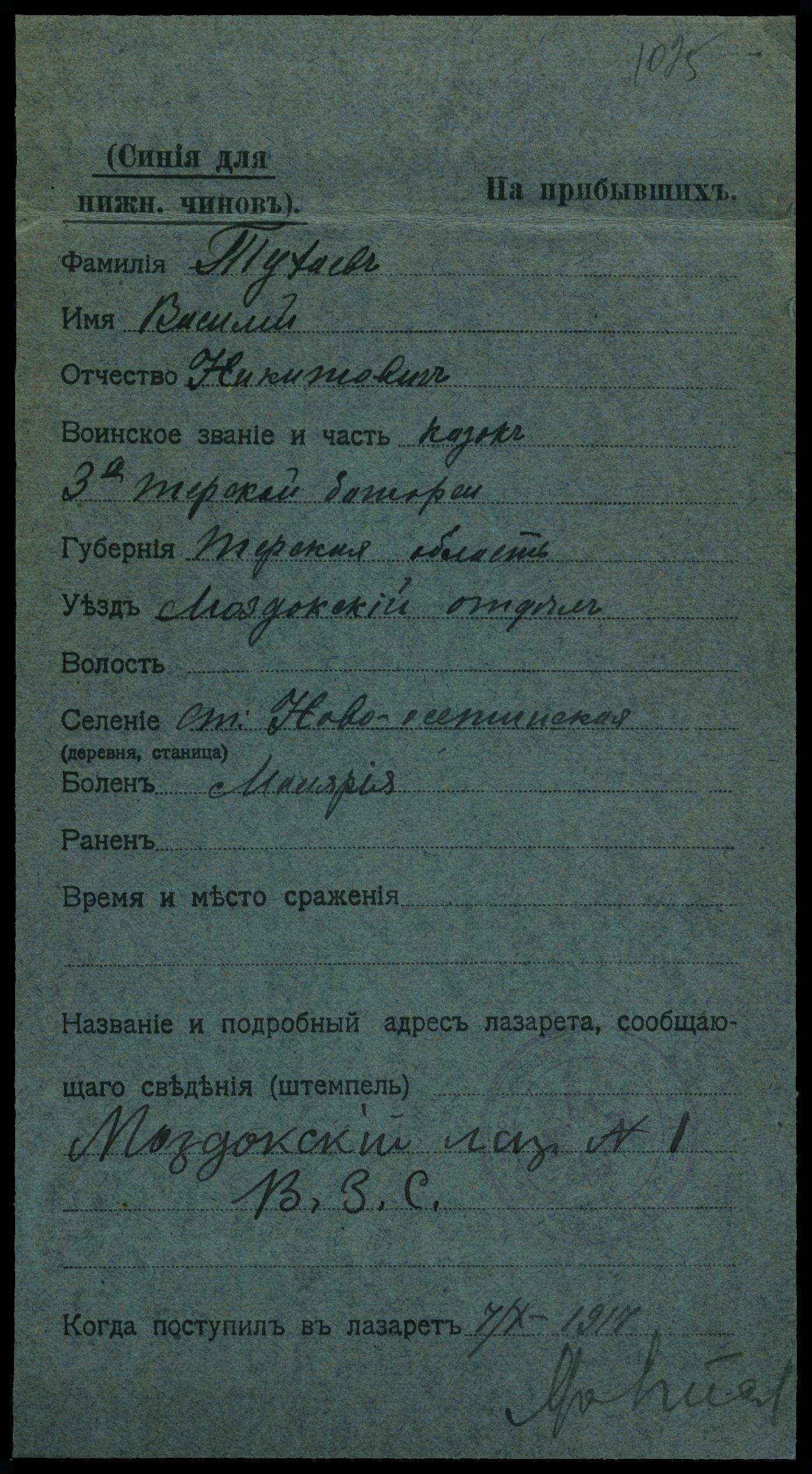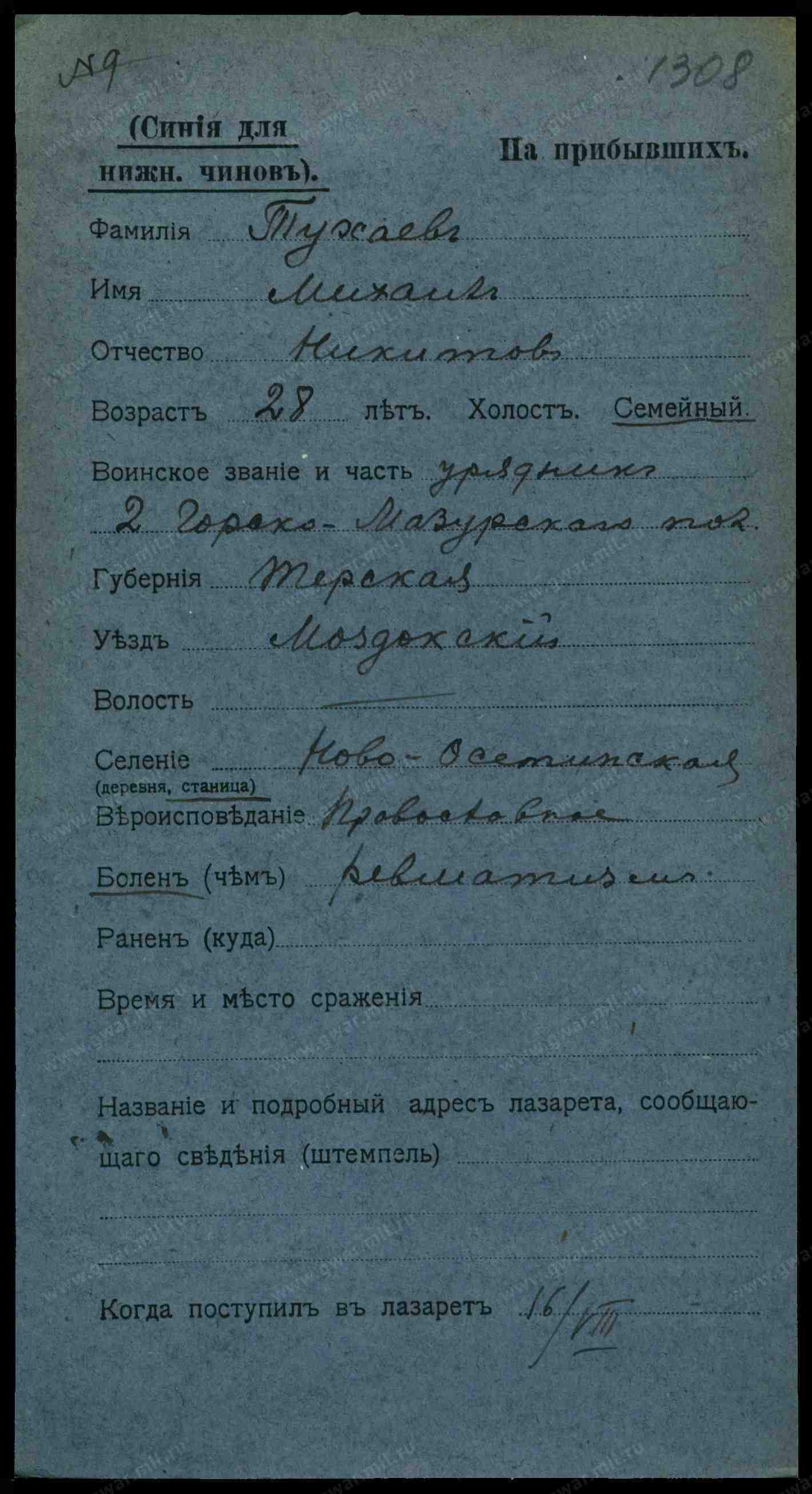 26708 Тухаев Михаил Петров. 1875. Отст. казак (хлебопашец), 28 л., родился и приписан в станице Новоосетинской, Пятигорского окр., Терской обл.; приговорен Мир. Суд. 3 уч. Владикавказского окр., за обман, по 174 ст. Уст. о нак., в тюрьму на три месяца. Приг. обр. к исп. 2 Мая 1875 г.