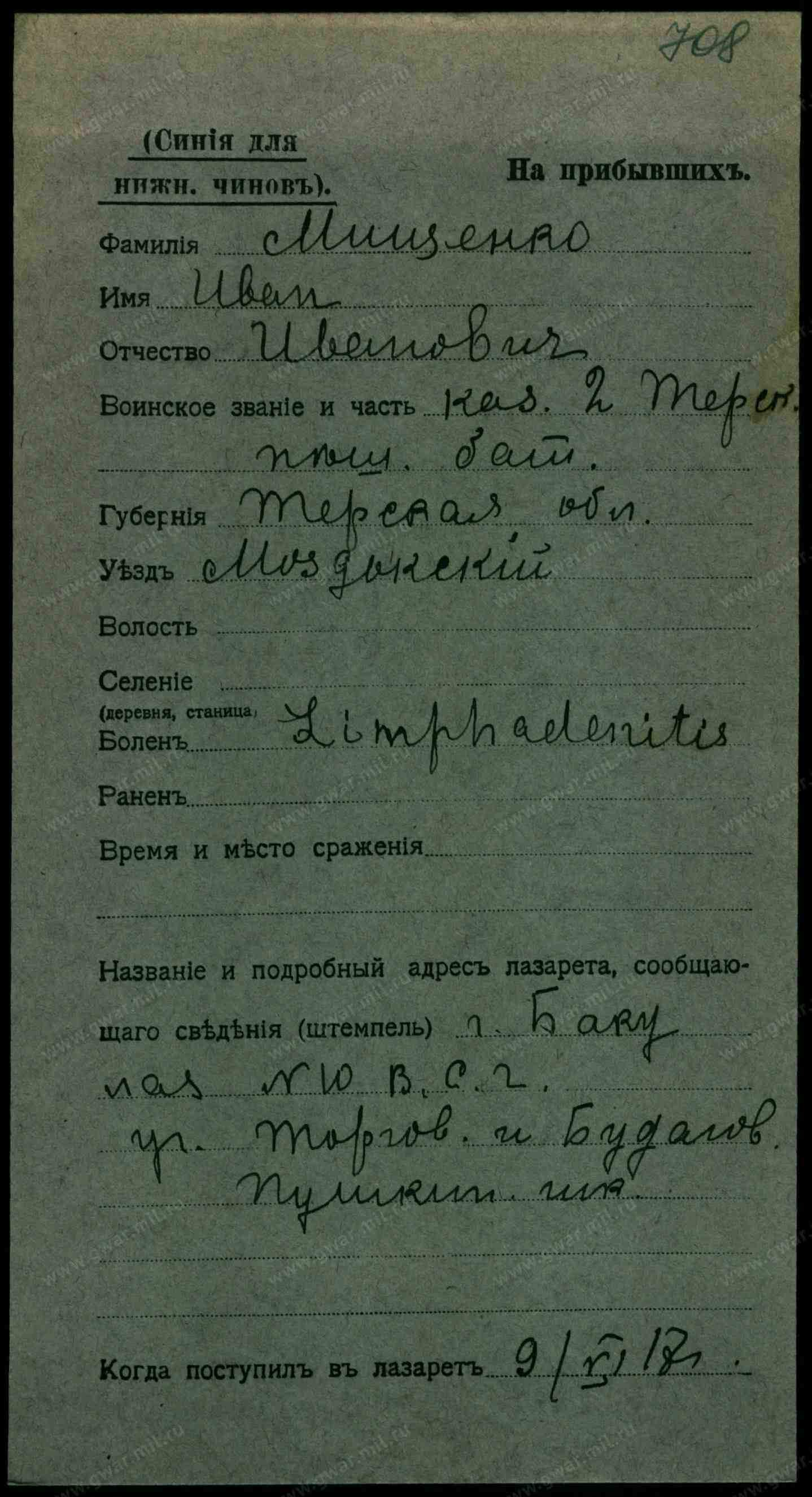 57203 Мищенко, Иван Ефимов. Каз. ст. Прохладной, Моздокск. отд., 32 л.; — М. С. 6 уч. Владикавказ. окр., 169, 170 и 171 М., тюр. 10 м. Исп. 25 Апр. 906.