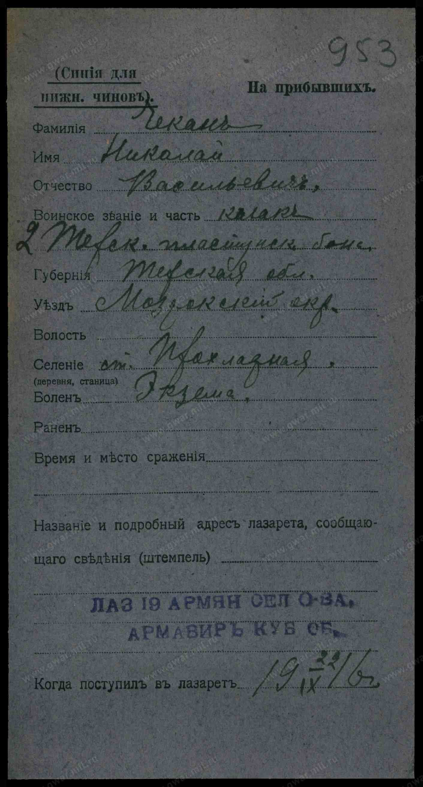 Тип документа Карточка на прибывших (нижние чины)
