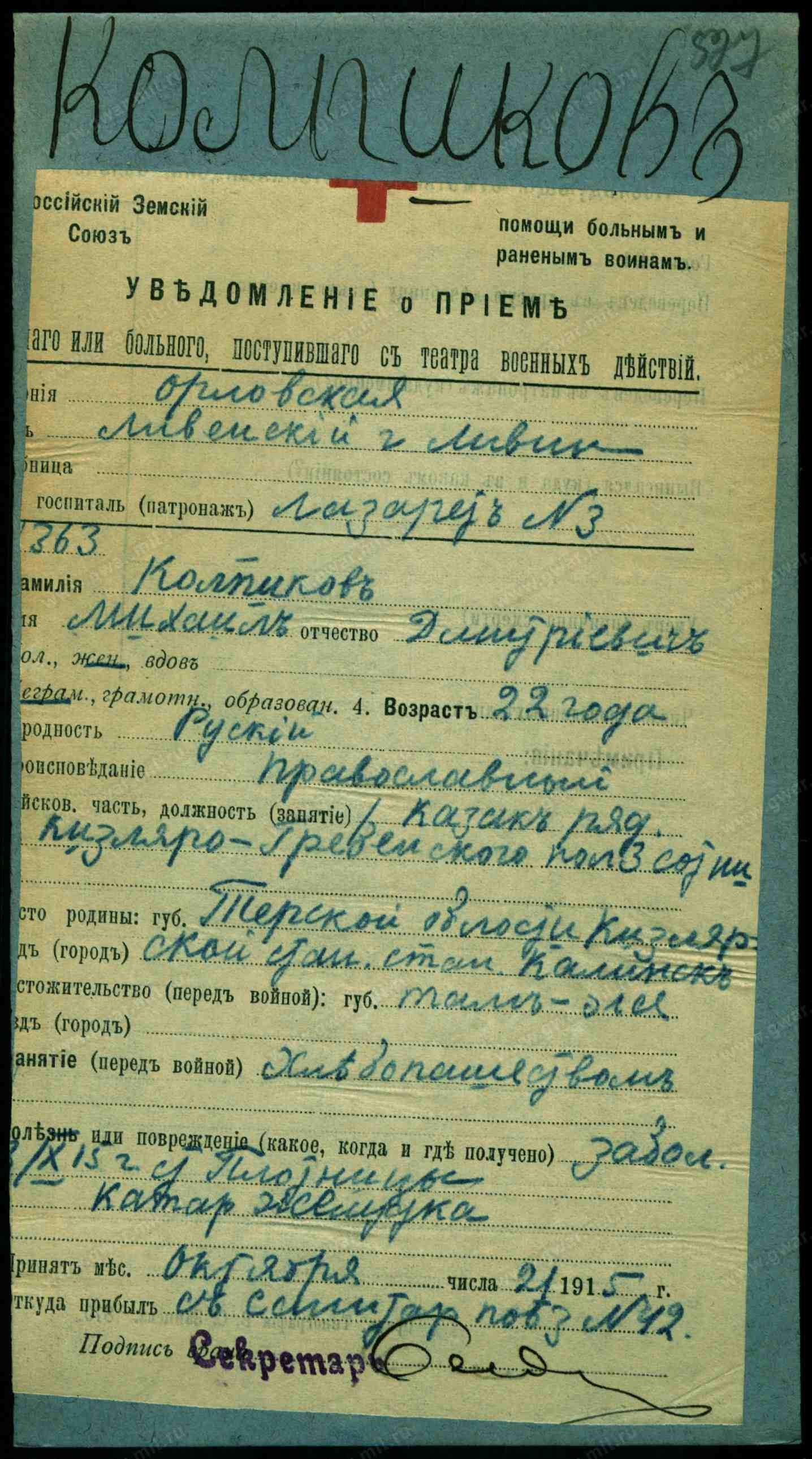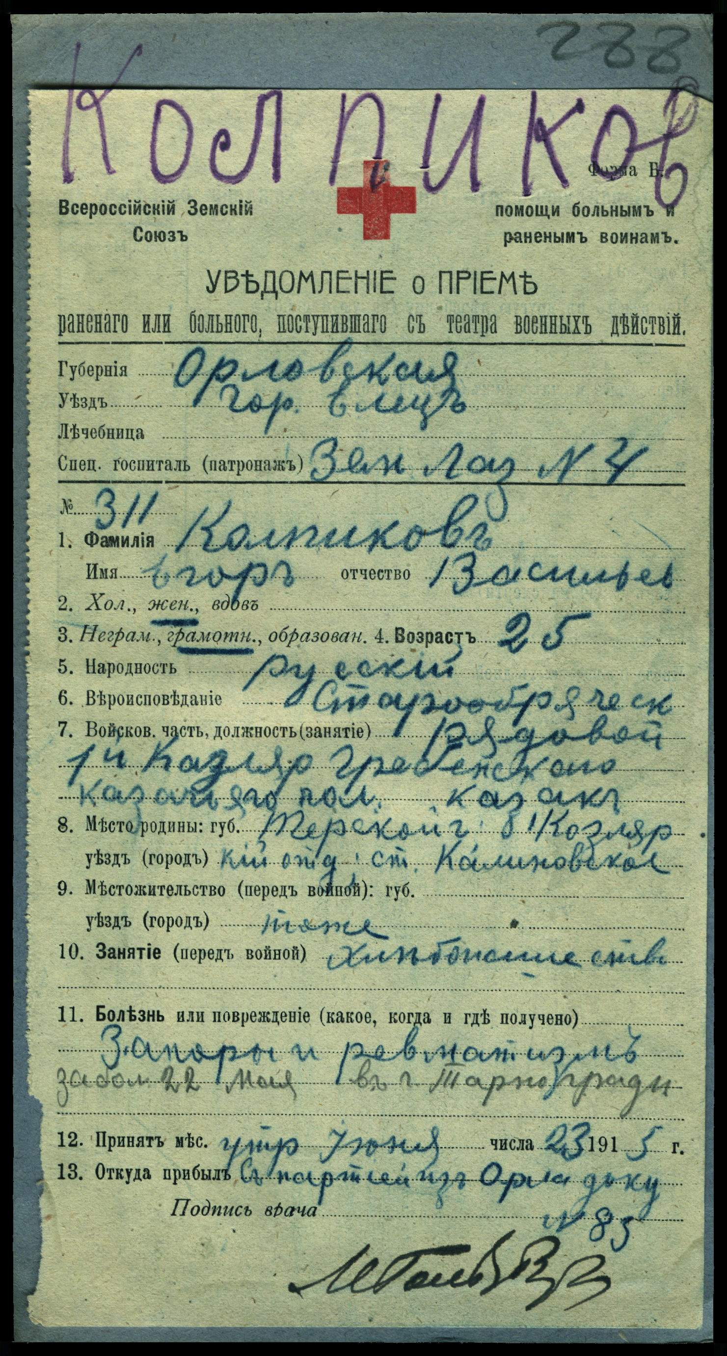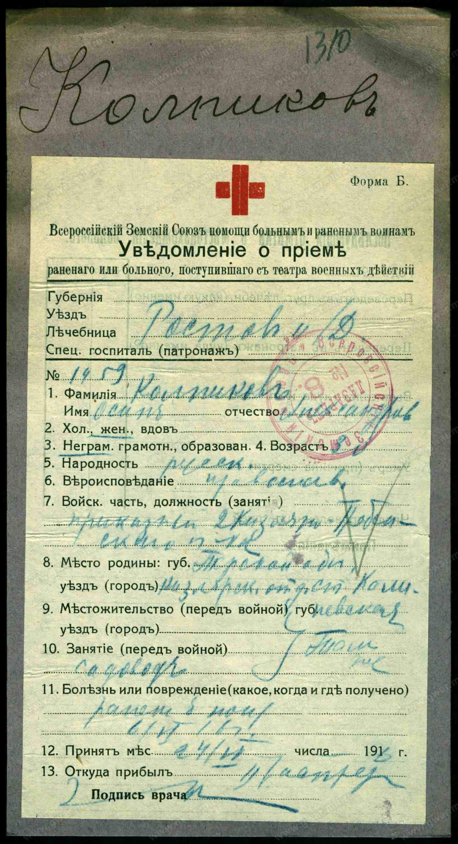 Красноармеец __.__.1897 Орджоникидзевский край, Наурский р-н, ст. Калиновская , Место службы: 109 ксп. Из госпиталя