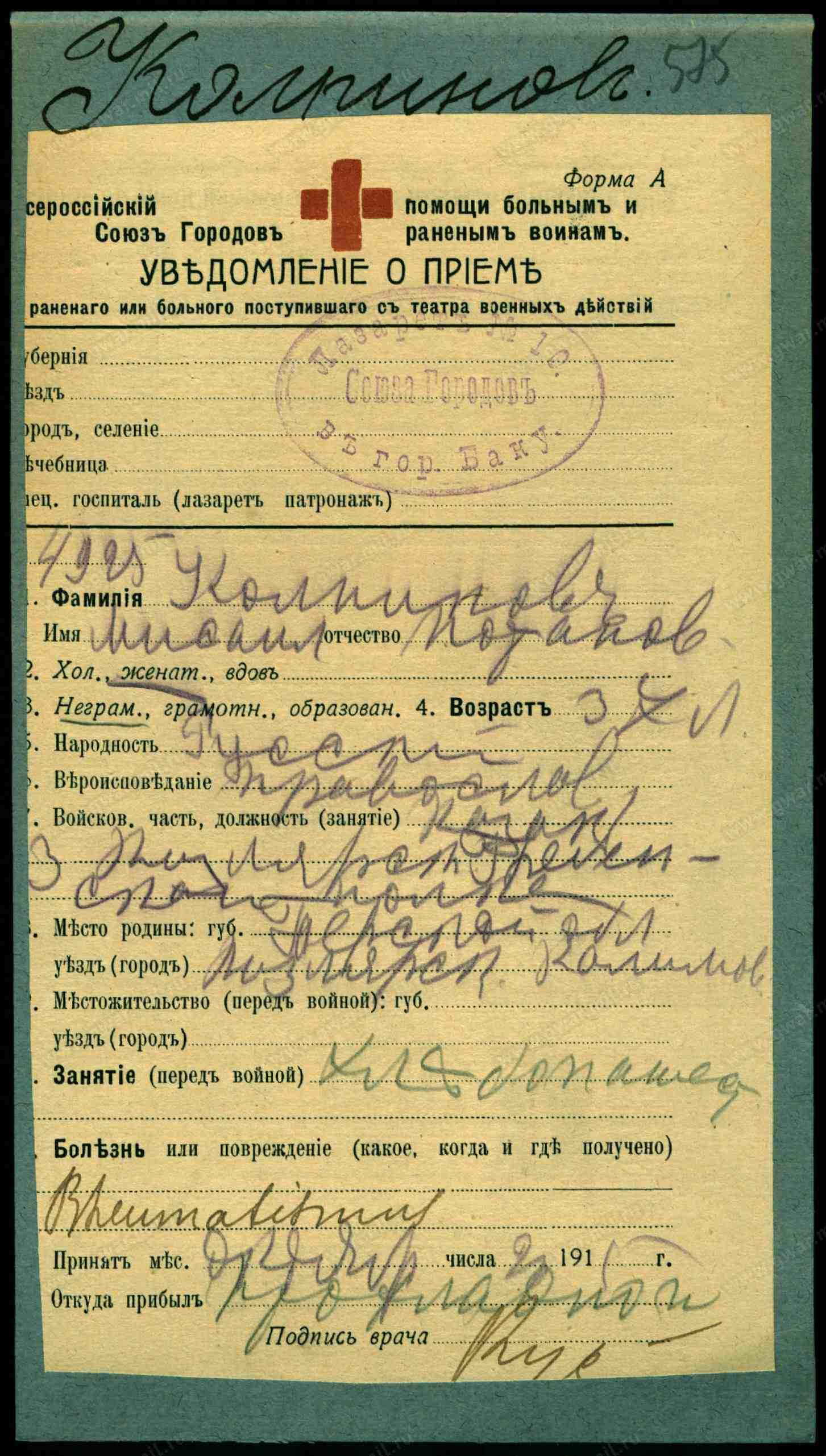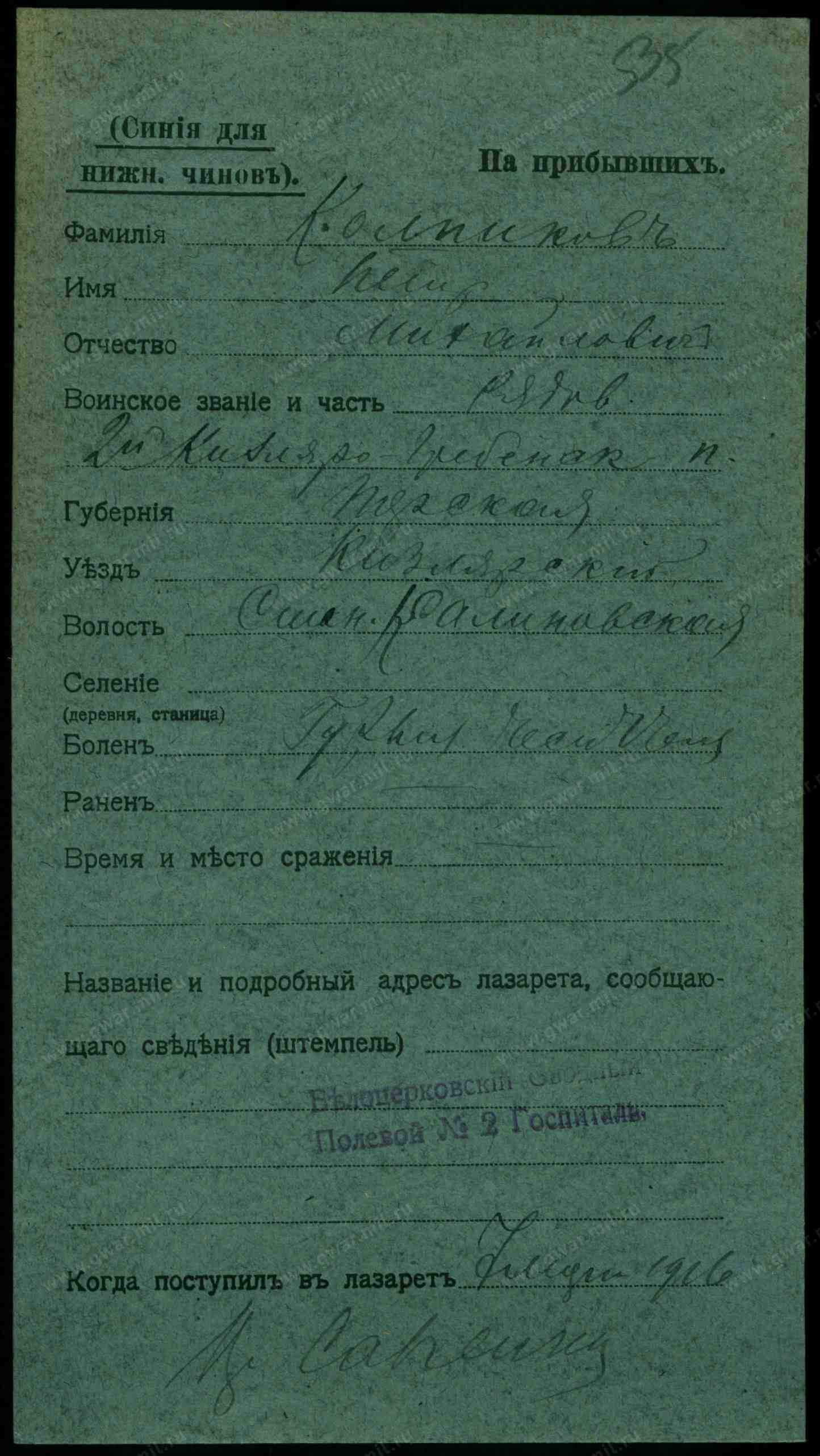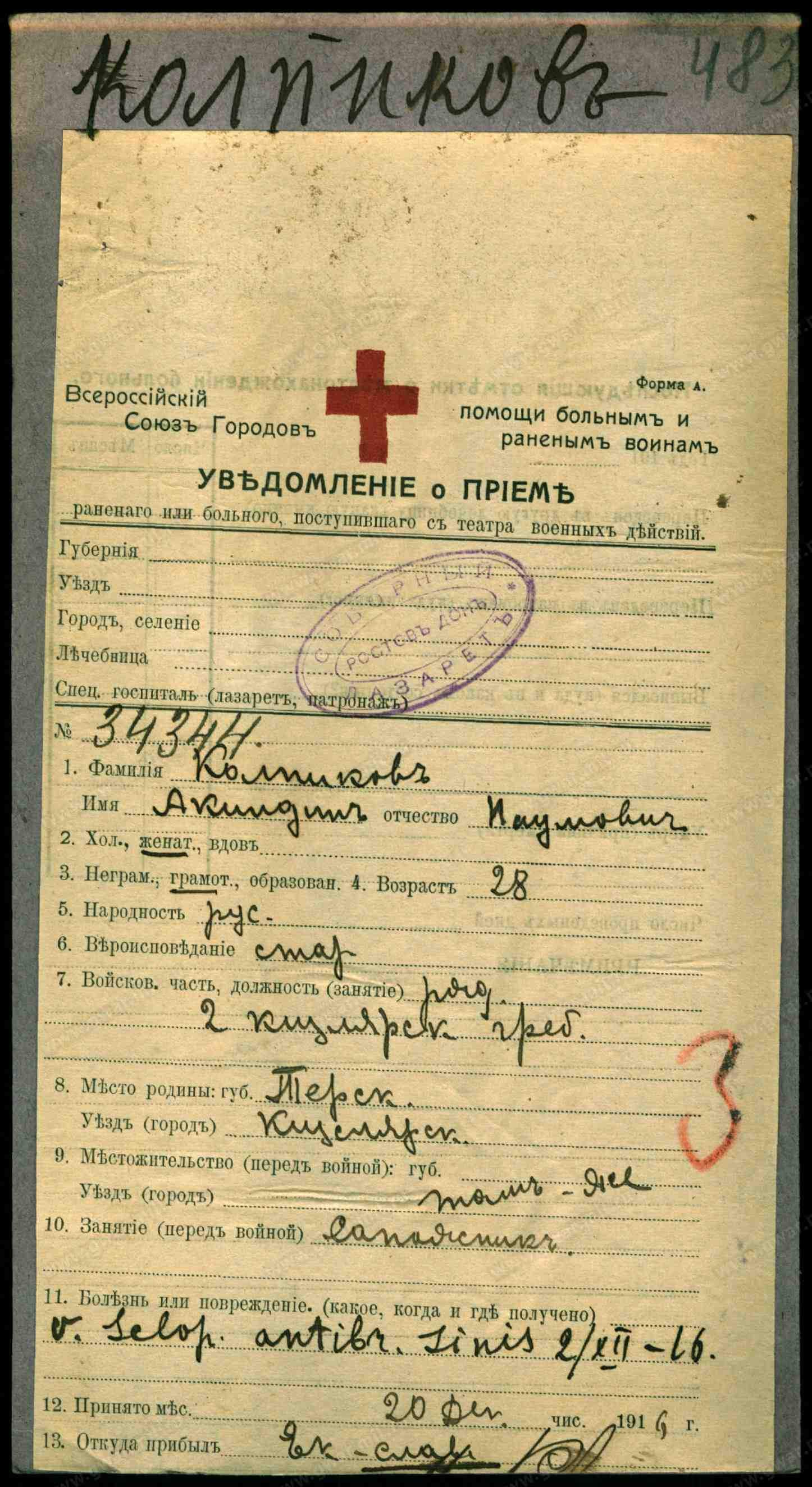 Красноармеец __.__.1897 Орджоникидзевский край, Наурский р-н, ст. Калиновская , Место службы: 109 ксп. Из госпиталя