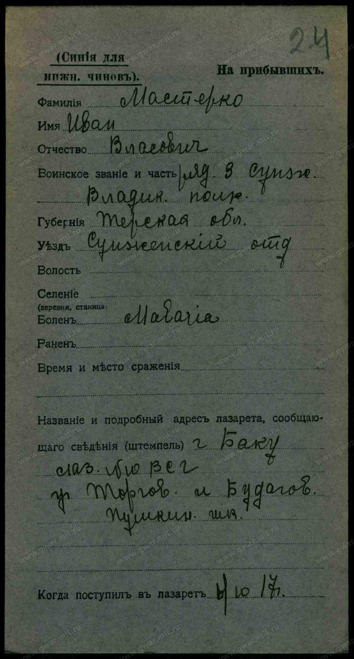 Тип документа Карточка на прибывших (нижние чины)