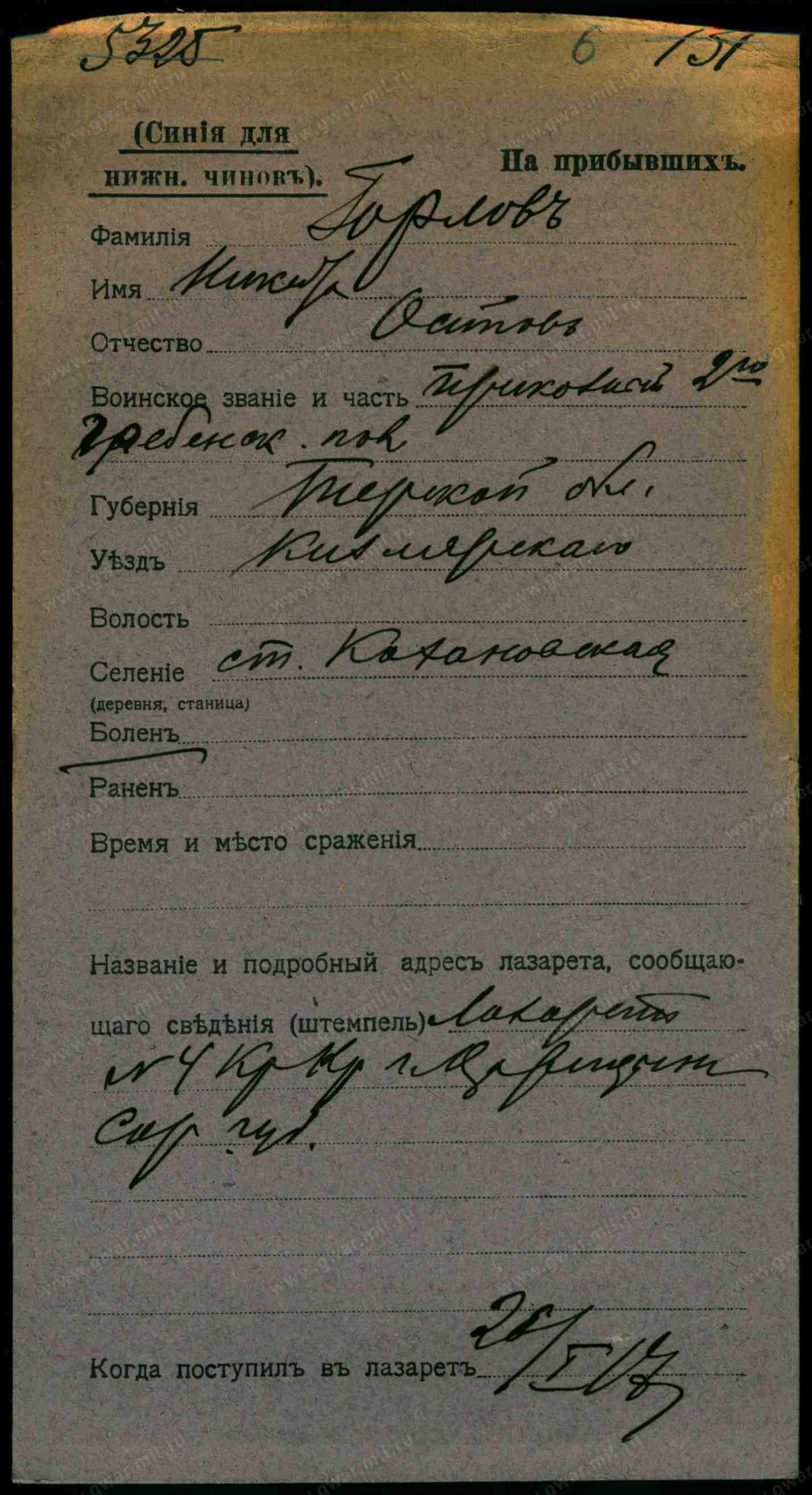 1. Горлов Иосиф Тарасович, хозяин, 28 лет, казак, родился здесь, временно отсутствует, правосл., родной язык малороссийский, грамотный, в 1 клас. учил. М.Н.Пр., земледелец, продажа дров, терский льготный казак.