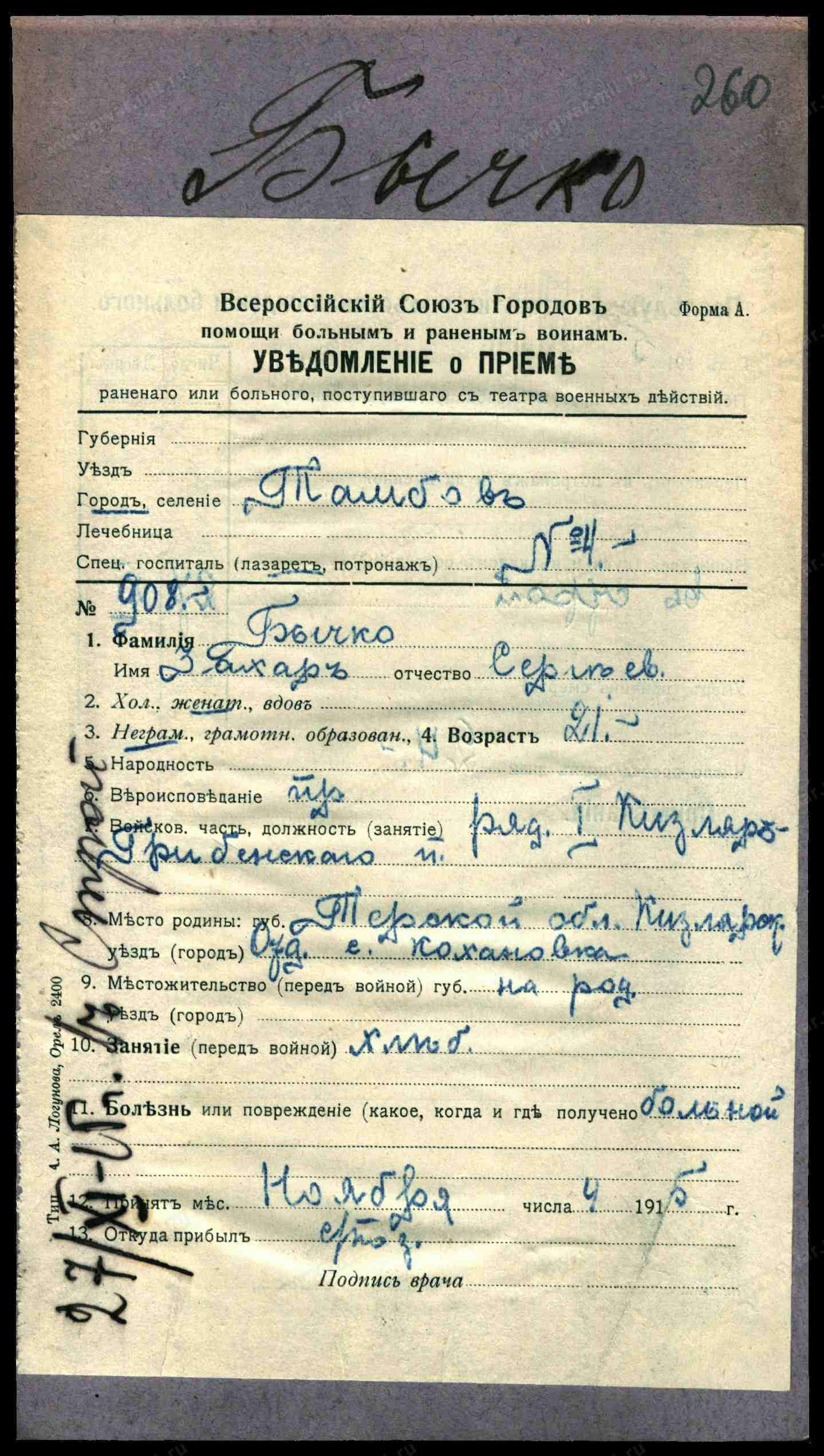 3. Бычкова Варвара Карпова, бабушка, 79 лет, вдова, казачка, родилась в Черниговской губ., Имглинского уезда, селе Нивное, приписана здесь, правосл., родной язык русский, неграмотная, при внуке.