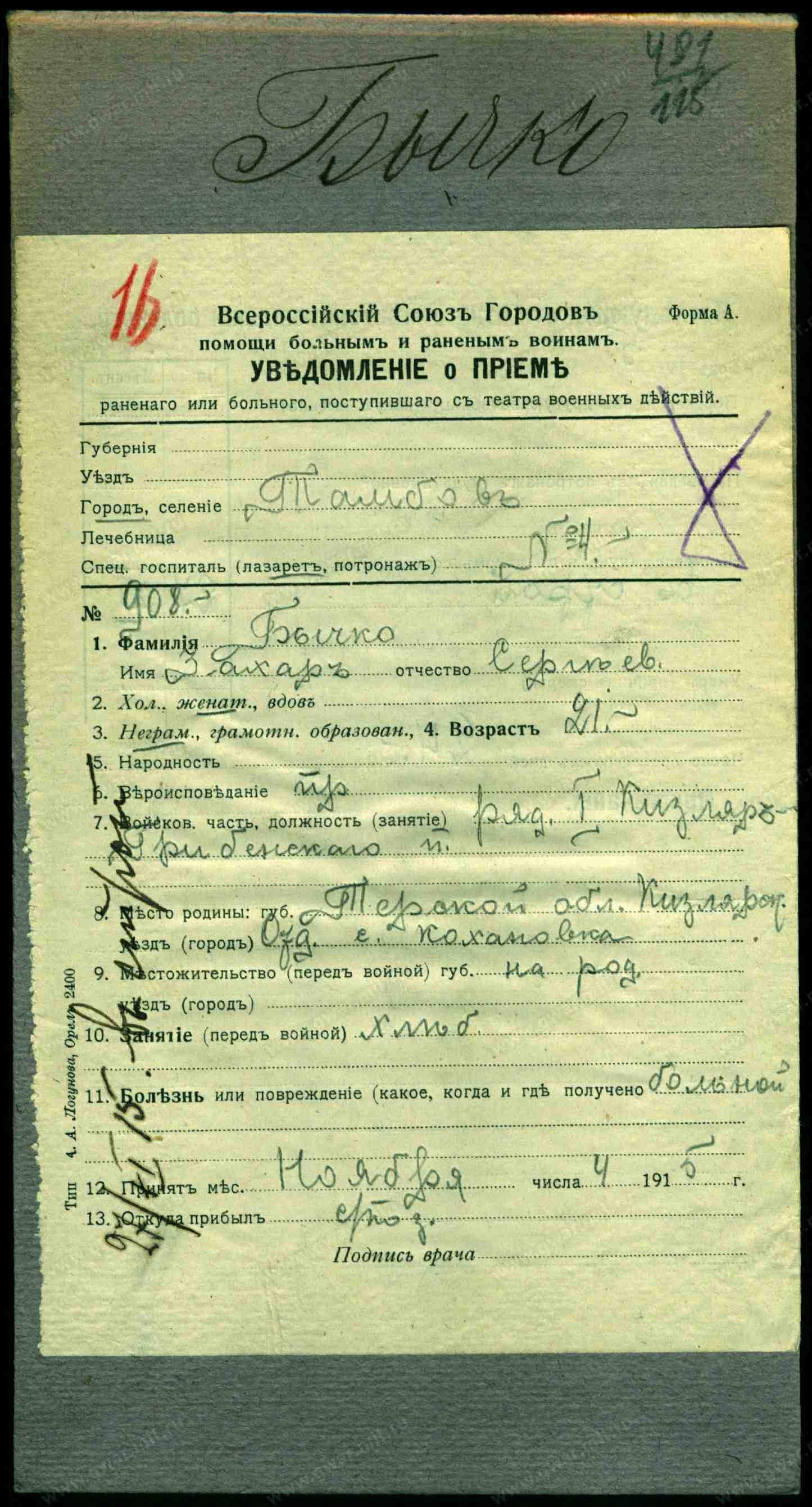 1. Бычков Тарас Данилов, хозяин, 38 лет, казак, родился здесь в Терской обл., правосл., родной язык русский, неграмотный, земледелец, охотничий пром., продажа дров.