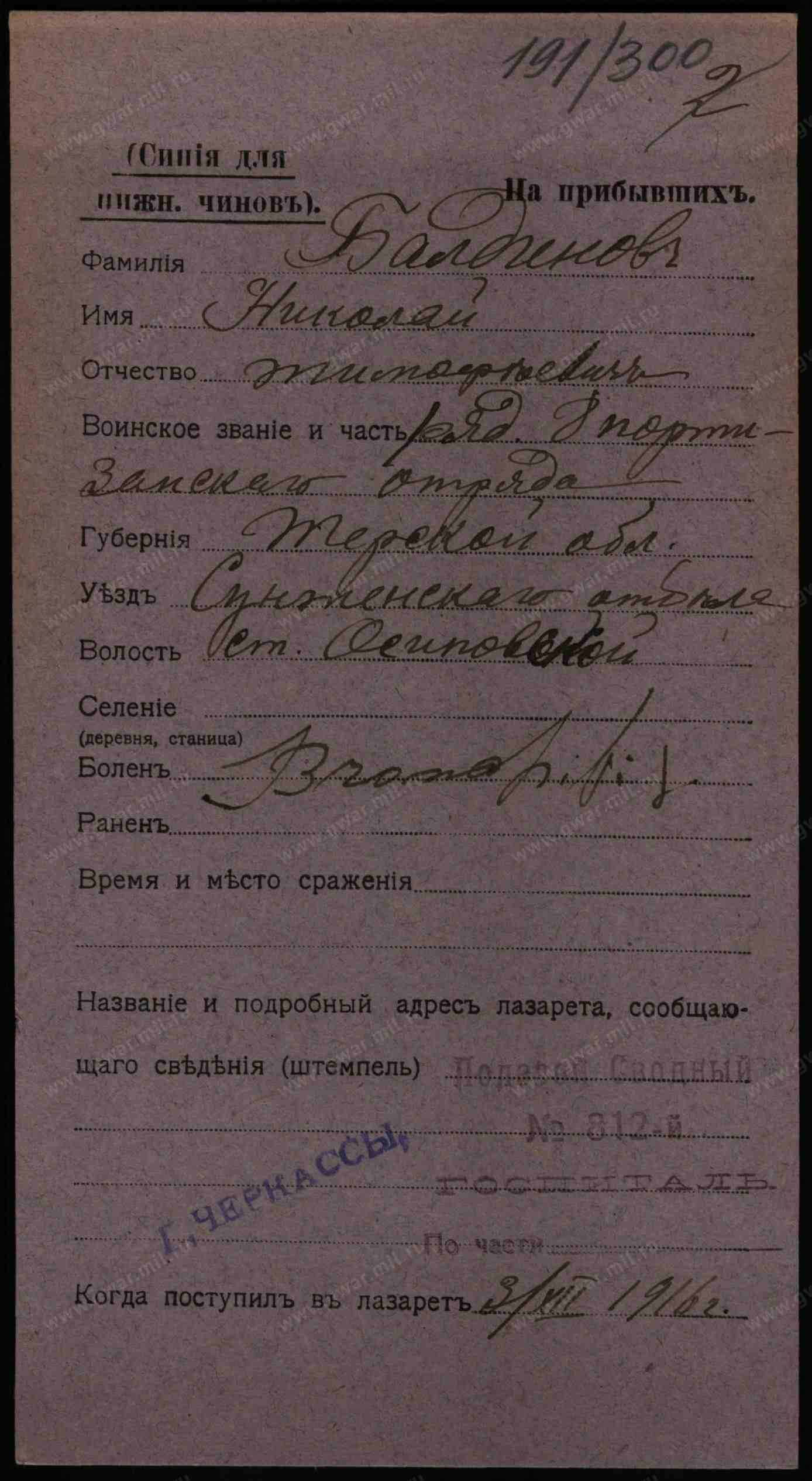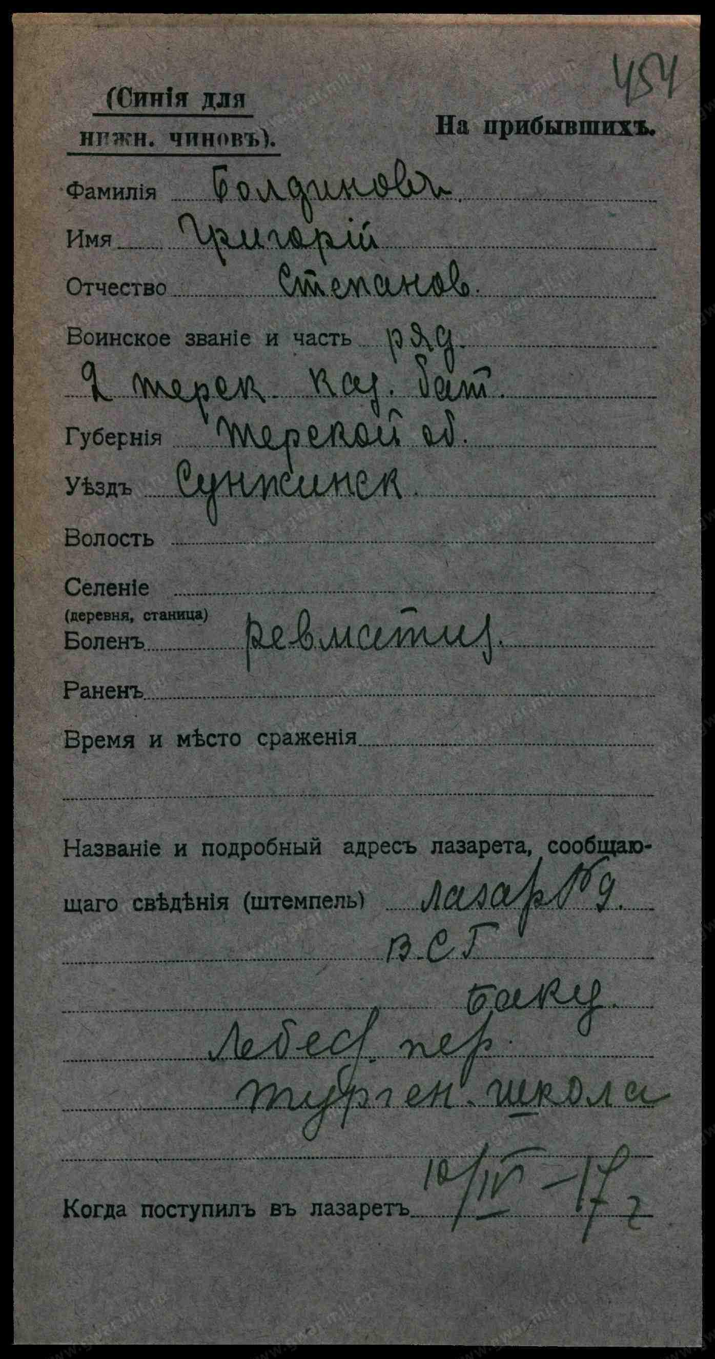 84410 Болдинов, Николай Тимофеев. Каз. ст. Ассинской, Сунженск. отд., 18 л.; — М. С. 3 уч. Владикавказ. окр., 170 М., тюр. 7 м. Исп. 30 Нояб. 906.