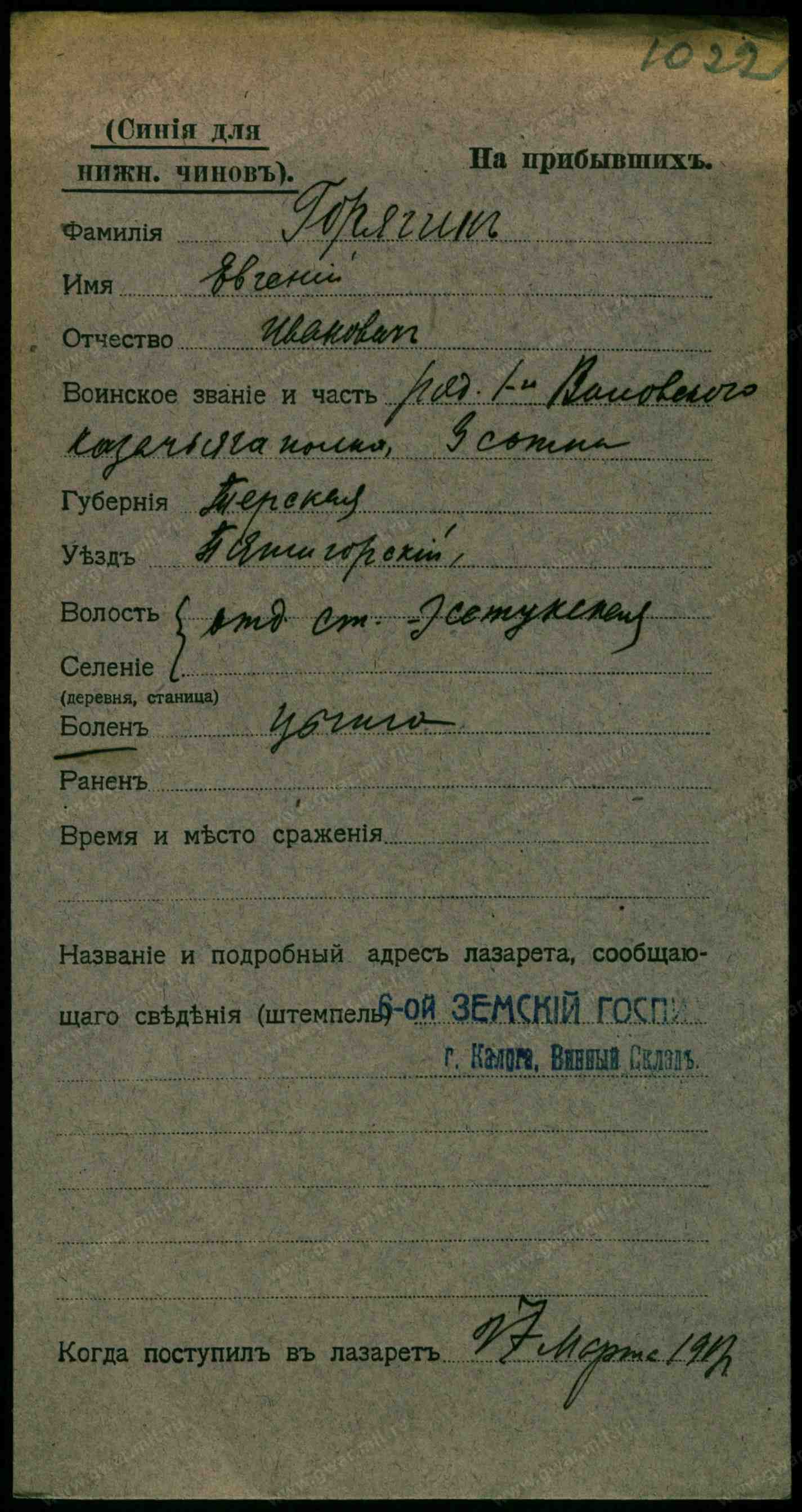 Место рождения Терская обл., Пятигорский отдел, н.п. Ессентуки