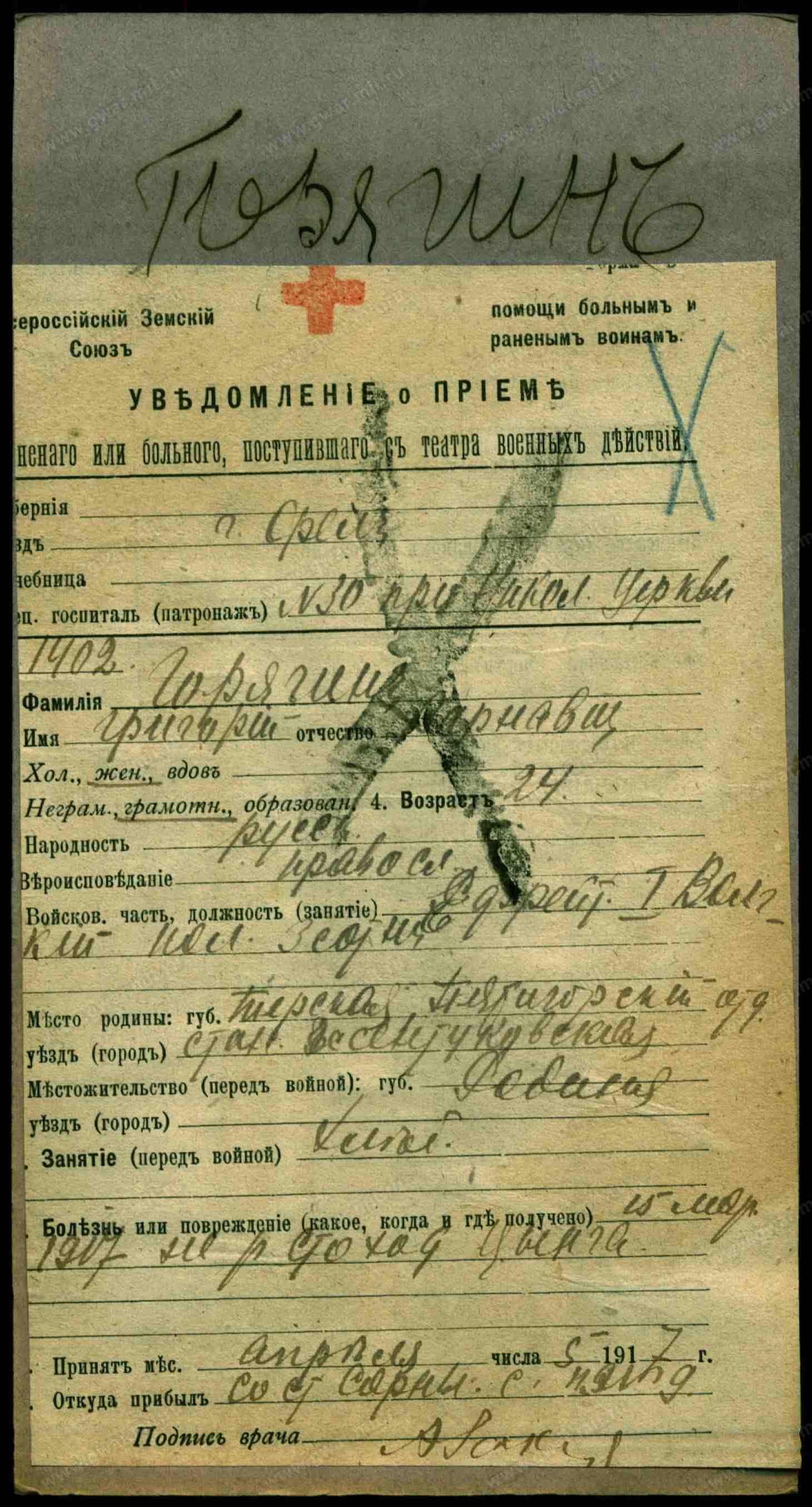 Тип документа Уведомление о приеме раненого