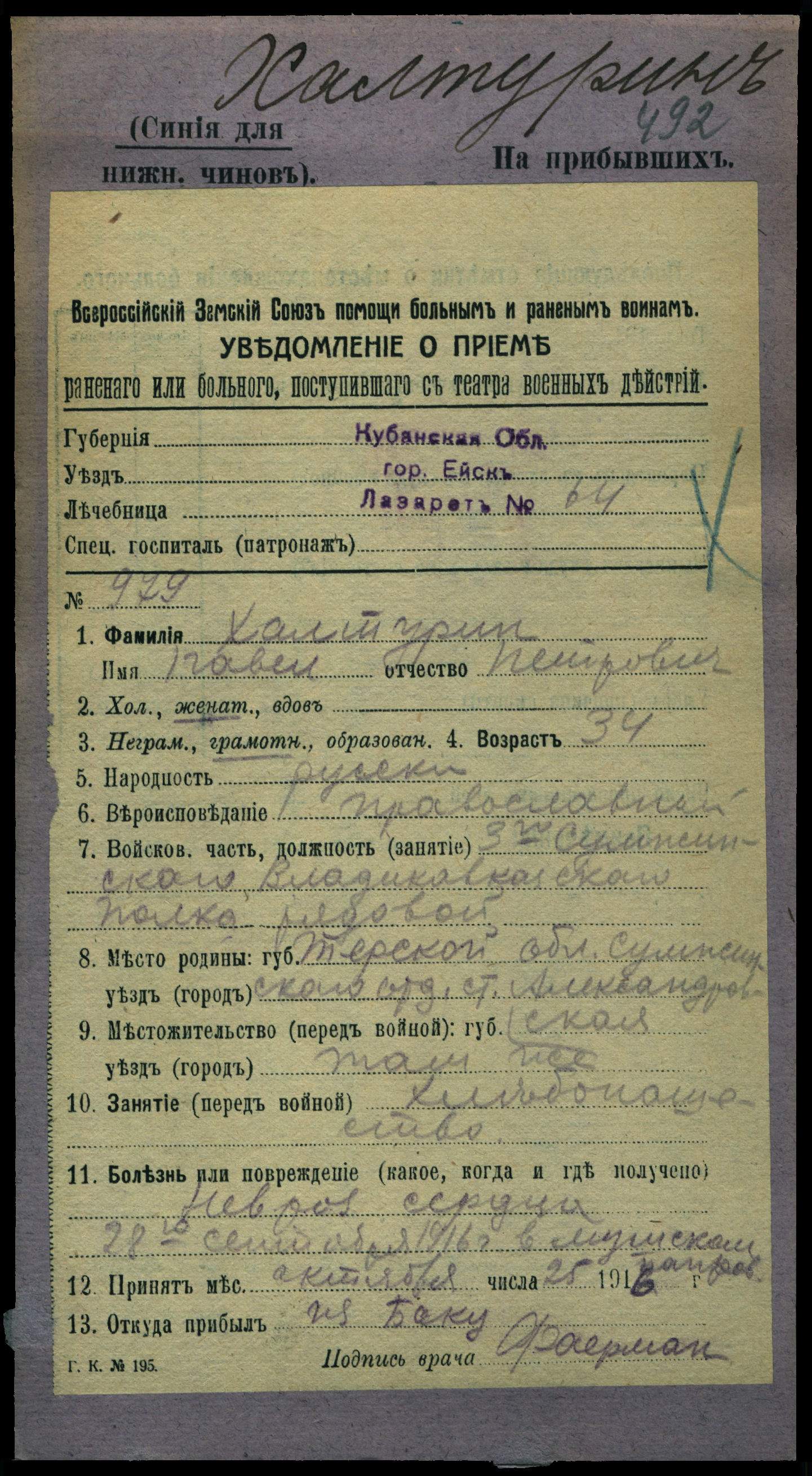 Место рождения. Губерния Терская обл.